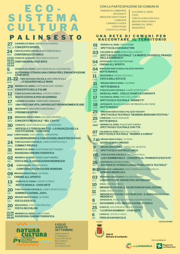 Grazie al Bando Lombardia Style 2026 di Regione Lombardia, il Comune di Romano di Lombardia, in qualità di Ente Capofila dell’aggregazione che vede coinvolti i Comuni di Antegnate, Brignano Gera d’Adda, Camisano, Canonica d’Adda, Caravaggio, Cividate al Piano, Cologno al Serio, Covo, Fara Olivana con Sola, Misano Gera d’Adda, Mornico al Serio e Mozzanica promuove le iniziative inserite nel palinsesto di Eco-Sistema Cultura che prevede, nel corso del 2026, quasi 70 eventi culturali. Rievocazioni storiche, rassegne di teatro, cinema e tante occasioni per scoprire il territorio, la storia e la vivacità culturale dei nostri tredici comuni.
