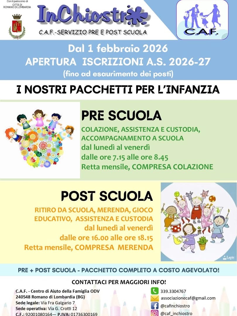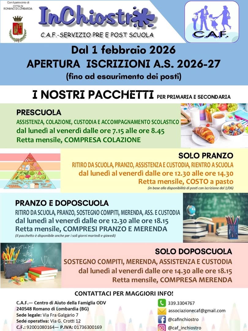 Si informa della possibilità di usufruire dei servizi offerti dall’associazione Centro di Aiuto Famiglia O.D.V. – C.A.F. InChiostro, che propone dei pacchetti per i bambini delle Scuole dell’Infanzia, Primarie e Secondarie di Primo Grado, del territorio di Romano di Lombardia.