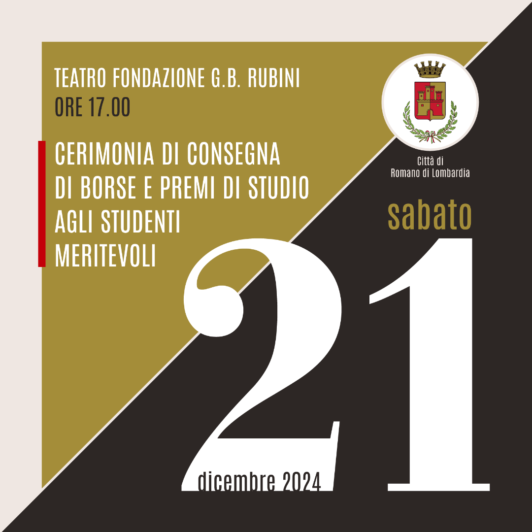 Sabato 21 dicembre, alle ore 17.00 presso il Teatro della Fondazione "G.B. Rubini" si svolgerà la cerimonia di consegna delle Borse e dei Premi di Studio alle studentesse e gli studenti meritevoli residenti nel comune di Romano di Lombardia per l'anno scolastico 2023-2024.