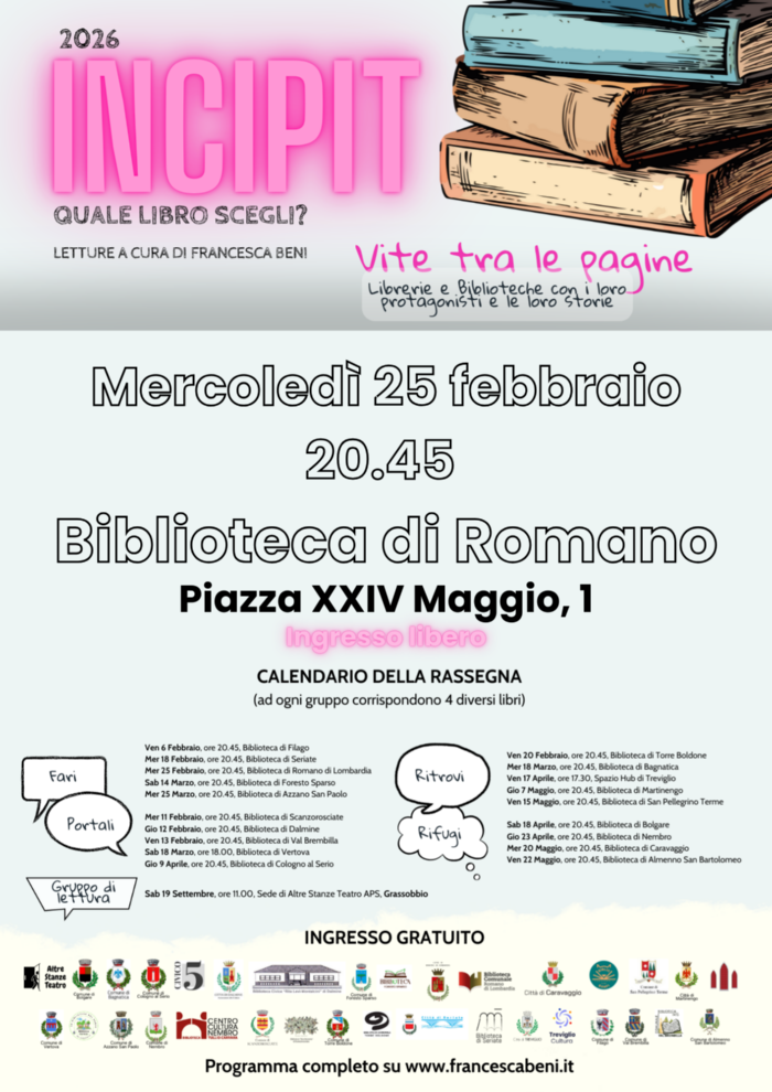 Durante l’ultimo incontro, che si terrà nella Biblioteca di Almenno San Bartolomeo, verrà decretato il libro vincitore di questa quarta edizione di “Incipit: quale libro scegli?”. Si avrà tempo tutta l’estate per leggerlo per poi incontrarsi nella sede di Altre Stanze Teatro APS a Grassobbio, sabato 19 settembre, per discuterne insieme a Francesca.