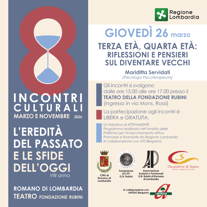 Gli incontri culturali "L'eredità del passato e le sfide dell'oggi" sono promossi dall'Associazione Anziani e Pensionati “G.B. Rubini", con la referenza organizzativa di Anteas Bergamo APS, la collaborazione del Comune di Romano di Lombardia, della Cooperativa Sociale Gasparina di Sopra e della Fondazione Opere Pie “G.B. Rubini”.