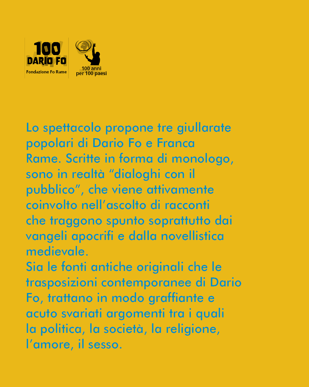Lo spettacolo propone tre giullarate popolari di Dario Fo e Franca Rame. Scritte in forma di monologo, sono in realtà “dialoghi con il pubblico”, che viene attivamente coinvolto nell’ascolto di racconti che traggono spunto soprattutto dai vangeli apocrifi e dalla novellistica medievale. Sia le fonti antiche originali che le trasposizioni contemporanee di Dario Fo, trattano in modo graffiante e acuto svariati argomenti tra i quali la politica, la società, la religione, l’amore, il sesso.