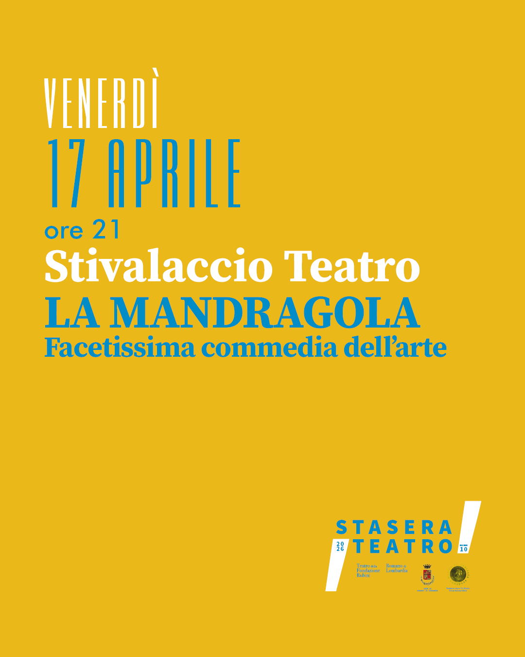 Venerdì 17 aprile alle ore 21.00 presso il Teatro della Fondazione Rubini, di Stivalaccio Teatro presenta "La Mandragola", facetissima commedia dell’arte.