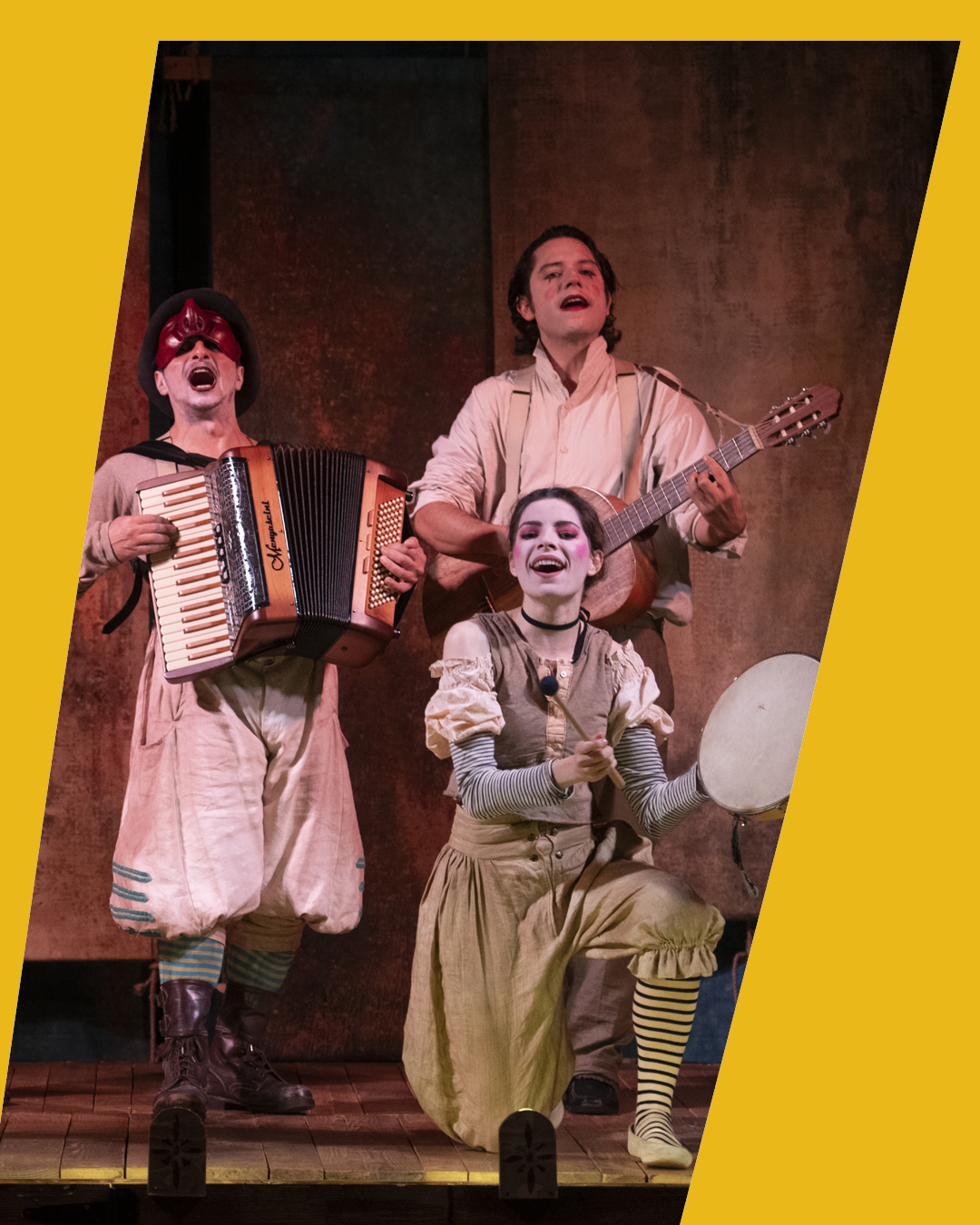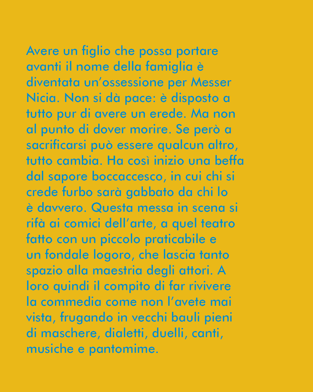 Avere un figlio che possa portare avanti il nome della famiglia è diventata un’ossessione per Messer Nicia. Non si dà pace: è disposto a tutto pur di avere un erede. Ma non al punto di dover morire. Se però a sacrificarsi può essere qualcun altro, tutto cambia. Ha così inizio una beffa dal sapere boccaccesco, in cui si crede furbo sarà gabbato da chi lo è davvero. Questa messa in scena si rifà ai comici dell’arte, a quel teatro fatto con un piccolo praticabile e un fondale logoro, che lascia tanto spazio alla maestria degli attori. A loro quindi il compito di far rivivere la commedia come non l’avete mai vista, frugando in vecchi bauli pieni di maschere, dialetti, duelli, canti, musiche e pantomime.